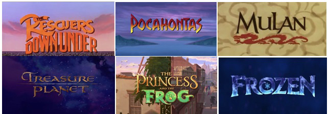 End titles of The rescuers down under, (Schumacher, 1990), Pocahontas (Pentecost, 1995), Mulan (Coats, 1998), The Treasure Planet (Clements, Conli & Musker, 2002), The Princess and the Frog(Del Vecho & Lasseter, 2009) and Frozen (Del Vecho & Lasseter, 2013).