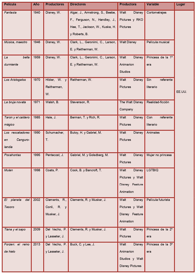 For the present study the reference point used is “The Disney Classics”, a collection of 60 animated feature films produced between 1937 and 2016. These movies are, for the most part, characterised by classic stories. Of this collection, a total of 12 were selected for analysis, based on 12 variables which characterise the producer. These examples are also representative of almost every decade during which productions have been distributed. One movie per decade was selected, with the exception of the examples from the 80s, 90s and 2000 respectively due to the large number of productions released during these latter periods. Consequently, the sample is representative of the diversity of productions created by Disney. Each film is representative of the variables constant in the producer’s cinematographic style.
