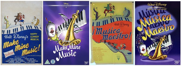 In the original poster, in English for Make Mine Music! we see the depiction of two child like figures dancing on a piano keyboard, surrounded by wind and percussion instruments. Again the music is the advertising factor, invoking great orchestras and directors. As ¡Musica Maestro! For the Spanish version, in the poster of the RKO distributor the same scheme is maintained but transmutes into red in the central area, which in the English version is an intense blue. The typography is different, imitating the original maintaining upper and lower case, simulating the scholar-style calligraphy of the time. When it was re-released on DVD, the English version and the Spanish translation both retained the same colour scheme, composition and typography. Letters imitates the musical graphics and the instruments are retained, these seen dancing on the roof, incorporating a whale dressed as a Tyrolean prince (in reference to the principal character of the latest short film The Whale who Wanted to Sing). The curious dancing “clarinet” (which appears like a hornpipe) is a metaphorical homage to Benny Goodman, American clarinetist.