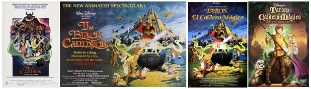 In The Black Cauldron we return to medieval references, as reflected in the letters of the title. However, there is great variety of styles presented in both the English and Spanish using Celtic style upper case lettering, especially the B in the word ‘Black’ in the original poster, but which in the Spanish version uses unattractive, insipid fonts, both in the original poster as well as the DVD cover which was released on the 25th anniversary of the movie’s release. Here we found a certain similarity to the aesthetic predominating in the covers of children’s books of the long epic syle.