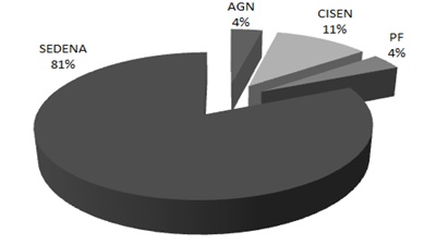 Posteriormente, se procedió a la sistematización en una base de datos que permitiera identificar entre otros aspectos: la fecha, el folio, la dependencia a la que el ciudadano solicitó la información y desde luego el contenido de la solicitud de información y la respuesta. Derivado de esta sistematización se encontró que varias de las solicitudes presentadas por el buscador correspondían a una misma solicitud de información, así como también se halló que otras no estaban completamente relacionadas con el concepto de “inteligencia militar” por lo que fueron descartadas. Finalmente, la base de datos se integró con un total de 27 solicitudes de información registradas entre el periodo comprendido entre el 24 de junio de 2003 y el 8 de diciembre de 2016. De estas solicitudes el 81% fueron dirigidas a la Secretaría de la Defensa Nacional8, el 11% al Centro de Investigación y Seguridad Nacional, el 4% a la Policía Federal (PF) y el 4% al Archivo General de la Nación (AGN) como se muestra en el gráfico 1.