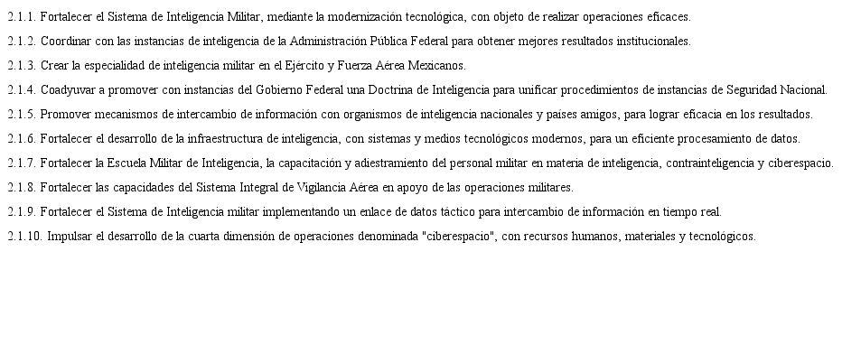Uno de los objetivos sectoriales del Programa es fortalecer el Sistema de Inteligencia Militar, para ello se plantea como estrategia “mejorar la organización, infraestructura tecnológica, capacitación de los recursos humanos y la coordinación interinstitucional” y presenta 10 líneas de acción (tabla 1).