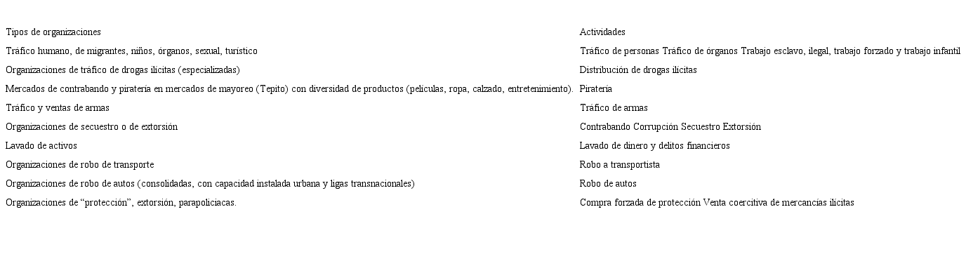 Tipos de actividades (económicas) ilícitas y especialización entre las organizaciones y sus fuerzas (dedicadas al narcotráfico, tráfico de órganos, apuestas, lavado de dinero, contrabando, piratería, ventas de armas, préstamos forzosos, extorsión, corrupción, recolección de deudas y prostitución).