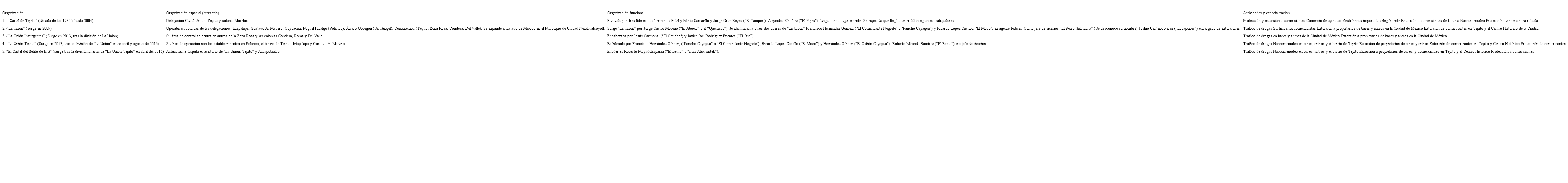 “La Unión” es una organización urbana de escala regional dedicada a la venta de drogas, la extorsión y el asesinato, localizada en el barrio de Tepito, una de las principales zonas comerciales situada al norte del Centro Histórico. Comprende aproximadamente 94 manzanas y llega a tener hasta dos millones de clientes en un fin de semana. El origen del grupo surge de las actividades realizadas por una banda llamada “el cártel de Tepito” en los años 80 (cuadro 3). Desde entonces ha evolucionado y se ha integrado con al menos cinco subgrupos: “La Unión”, “La Unión Tepito”, “La Unión Insurgentes”, el “Cártel del Betito de la B” y “Los Lobos”. Además de la extorsión y los asesinatos, cometieron el secuestro de 13 jóvenes en un bar de la Zona Rosa en 2013.
