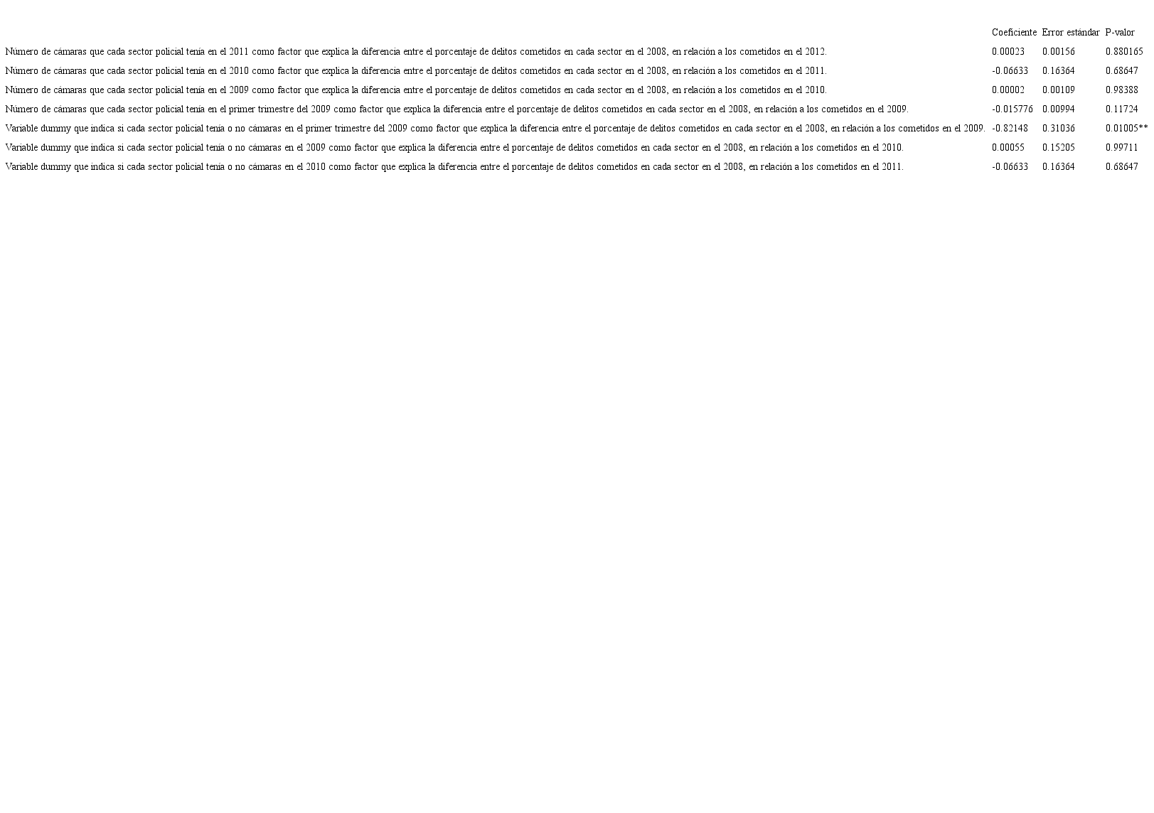 Tampoco existe evidencia que nos permita validar la segunda hipótesis (migración), debido a que no se observa un incremento en los porcentajes de delitos de las zonas sin cámaras o con menor número de cámaras. Incluso, se realizó un análisis complementario a la base de datos para ver si en las zonas con cámaras hubo un aumento o una disminución de las variables que miden las diferencias de porcentajes. Por ejemplo, en el primer corte temporal (Enero-Marzo del 2009) encontramos cuatro sectores con cámaras y en dos de ellos se observa un aumento en la incidencia criminal mientras que en los dos restantes se observa una disminución. Algo parecido se puede observar en el segundo corte temporal (Abril-Diciembre 2009) en el que hay 26 sectores con cámaras pero solo en 11 de ellos se observa una disminución en los eventos criminales. Por último, en el tercer corte temporal (2010) había 53 sectores con cámaras de los cuales se observa una disminución de los porcentajes de delitos en 33 de ellos.