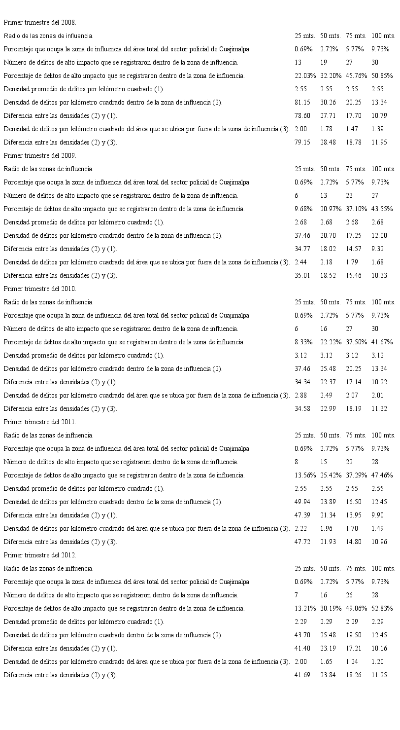 El análisis agregado puede tener algunos sesgos inherentes, debido que el efecto disuasorio no se materializa a través de zonas tan grandes como los sectores policiales, sino a través de pequeñas zonas aledañas a cada una de las cámaras de vídeo vigilancia. Por ello, es necesario analizar al menos un caso donde se pueda observar la incidencia criminal que se da en las inmediaciones de cada una de las cámaras. A continuación, se presenta un cuadro donde se resume el número de delitos de alto impacto que se presentaron en los primeros trimestres del 2008, 2009, 2010, 2011 y 2012 dentro de cada una de las zonas de influencia o buffers (25 mts., 50 mts., 75 mts. y 100 mts.). Es importante mencionar que en el 2008 y 2009 todavía no habían cámaras en el sector policial de Cuajimalpa, por lo que estos dos años servirán como línea base o grupo de control.