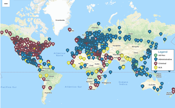 En la actualidad hay 70 muros alrededor del mundo; el 81% se construyó en el siglo XXI (Vallet 2014; Benach 2017). El año que más muros se construyeron fue 2015 (18), a lo que habría que sumar la propuesta del partido del electo presidente Bolsonaro de construir un muro en la frontera suroeste de Brasil con Paraguay. De igual manera, en este siglo proliferaron los Centros de Detención Migratoria. Existen en la actualidad 1268 en uso en todo el mundo (gráfico 1), en América (493, de esos, 210 en Estados Unidos y 58 en México) y Europa (377). La mayoría también fueron construidos en los últimos años. Todo esto configura lo que algunos autores han denominado “la época de la securitización” (Pallitto y Heyman 2008).