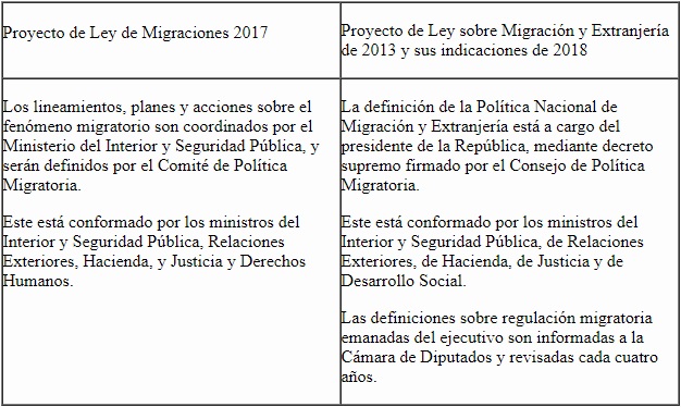 El primer proyecto considera el punto de vista de varios actores para definir una política migratoria, mientras que el segundo delega todas las facultades al ejecutivo, relegando a un segundo plano al Consejo de Política Migratoria, pues su única función es la de asesorar. Con base en esto, es posible afirmar que la propuesta de Piñera es más discrecional que la de Bachelet y, por lo tanto, se acerca más un modelo de gobernanza migratoria de securitización.