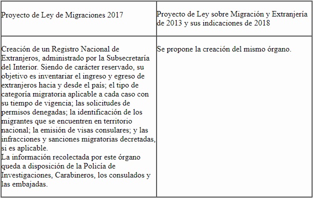 La confusión que provoca la doble acepción del concepto “migración segura” se resuelve al analizar los aspectos prácticos de los proyectos estudiados. El más significativo es la creación de un Registro Nacional de Extranjeros, que permite a la Subsecretaría del Interior recolectar información para llevar un control exhaustivo de los migrantes que entran y salen del país. En ambas propuestas se plantea que los datos recolectados por el organismo serán de carácter reservado y estarán a disposición de la Policía de Investigaciones, Carabineros y los consulados. Como en ninguna instancia se establece que podrán acceder a estos inventarios discrecionales instituciones vinculadas a la salud, a la educación u a otras prestaciones públicas, se infiere que su meta no es verificar la condición de los migrantes en materia de derechos humanos, sino establecer mecanismos para resguardar la seguridad nacional.