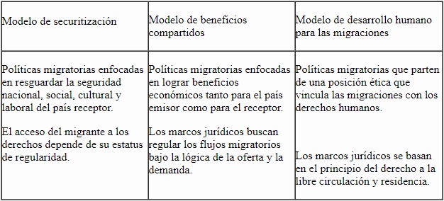 Para comprender el perfil de las propuestas migratorias hechas en Chile desde la llegada de la democracia y el conjunto normativo sobre migraciones vigente, se apela al concepto de gobernanza migratoria y a las diferentes categorías que existen con respecto a sus posibles modelos. El término “gobernanza migratoria” es definido por Lelio Mármora (2010) como el ajuste entre las percepciones y demandas sociales sobre las causas, características y efectos de los movimientos migratorios, así como las posibilidades e intencionalidad de los Estados para responder a dichas demandas en un marco de legitimidad y eficacia. El mismo autor plantea que existen tres modelos posibles de gobernanza migratoria: el de securitización, el de beneficios compartidos y el de desarrollo humano para las migraciones. A continuación, la tabla 1 presenta las definiciones de cada uno.