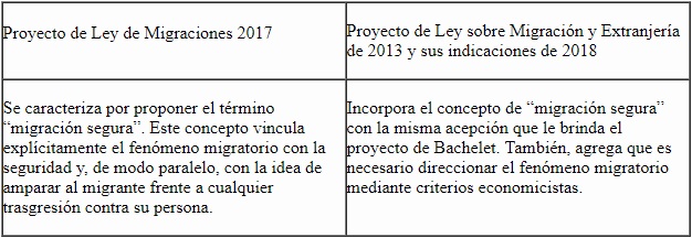 En ambos casos está presente el concepto de “migración segura”, que entiende, por un lado, que las migraciones deben ser abordadas desde la perspectiva de la seguridad y, por el otro, que el migrante debe ser protegido en su proceso de regularización. Se plantea que tanto en el proyecto de Bachelet como en el de Piñera prevalece la primera acepción, lo que se ratifica con las grandes facultades concedidas al Ministerio del Interior para prohibir el ingreso de aquellos extranjeros que, a su discreción, considere peligrosos.6