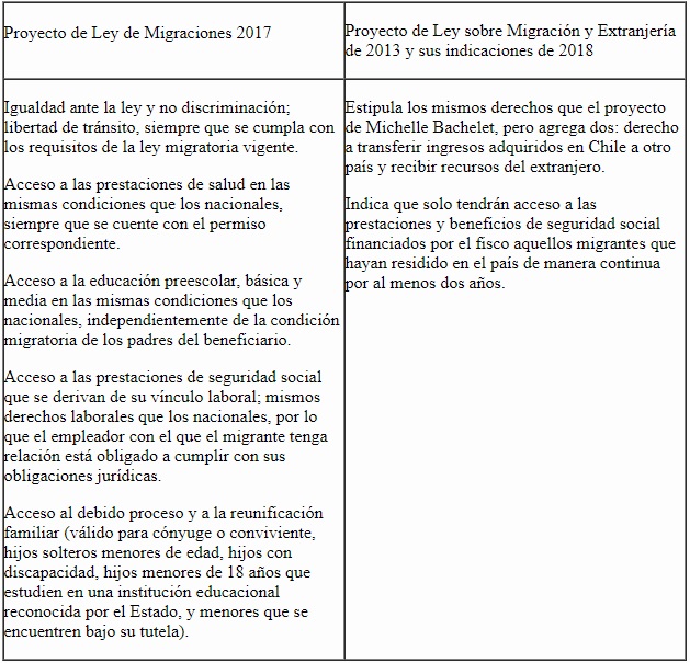 Como muestra la tabla, la primera diferencia entre los proyectos tiene relación con las dos precisiones que hace el segundo: que el migrante tiene derecho a transferir ingresos adquiridos en Chile a otro país y recibir recursos desde el extranjero. Pese a esto, es importante aclarar que, si bien el documento de Bachelet no estipula explícitamente lo mencionado, tampoco lo prohíbe. Por lo tanto, los extranjeros bajo su ley sí tendrían la posibilidad de enviar remesas a sus naciones de origen.