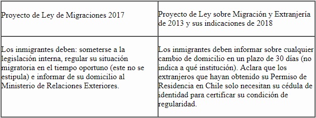 En relación con las obligaciones de los migrantes, las propuestas no muestran evidencias que permitan enmarcarlas dentro de un determinado modelo de gobernanza migratoria. Esto porque ambas imponen deberes similares a los que tienen los chilenos, salvo aquellos que tienen relación con la responsabilidad de regularización, al igual que casi todas las leyes sobre migraciones del mundo (tabla 5).