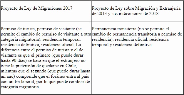 En relación con las categorías migratorias, las diferencias entre las dos propuestas son absolutamente semánticas, pues en la práctica pueden tener el mismo efecto. Si bien uno de los proyectos permite que el migrante pueda cambiar su estatus, el Estado está facultado, bajo ambas regulaciones, a negar una visa o a solicitar una especial, cuando estime conveniente (tabla 6).