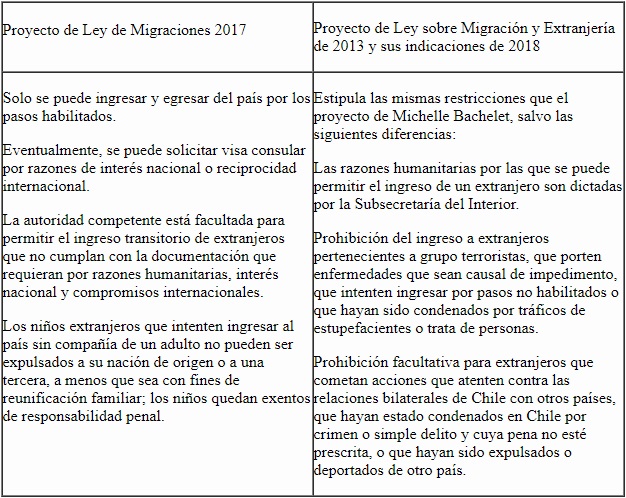 La idea de que la vigente Ley de Extranjería no puede enfrentar eficazmente el actual fenómeno migratorio en Chile es aceptada por todas las partes inmersas en el debate sobre el tema, con algún grado de injerencia sobre él. Sin embargo, la forma mediante la cual cada uno de los actores opina acerca del tema se reduce a la divulgación de vagas consignas, sobre todo en el caso de los que tienen más tribuna mediática y poder de decisión. Por tal razón, en esta sección se analizan de manera comparativa los proyectos de Ley de Migración propuestos por los Gobiernos de Michelle Bachelet y Sebastián Piñera. Dado que estas constituyen las proposiciones con más posibilidades de reemplazar a la normativa actual, se determina en qué modelo se enmarca cada una. Se aclara que el documento divulgado por el presidente Piñera en 2018 es el mismo que elaboró en 2013, solo que en esta ocasión agregó algunas indicaciones, que incorporan elementos del plan de Bachelet.