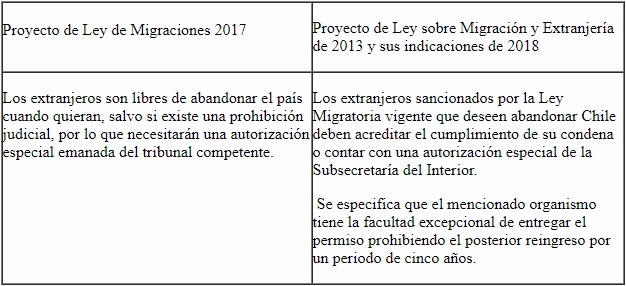 En cuanto a los mecanismos enmarcados en el modelo de gobernanza migratoria de securitización, el proyecto de Sebastián Piñera va más allá que el de Michelle Bachelet. Sobre el egreso de extranjeros, la propuesta de Bachelet plantea que se prohibirá la salida de aquellos migrantes que hayan violado la ley vigente, a menos que cuenten con la autorización de un tribunal competente; mientras que la de Piñera indica que la excepción solo se podrá dar con el permiso de la Subsecretaría del Interior. Por tanto, la segunda es considerablemente más discrecional, porque adjudica a un organismo administrativo, no judicial, la facultad de expedir salvoconductos para la salida del país a extranjeros con antecedentes penales.