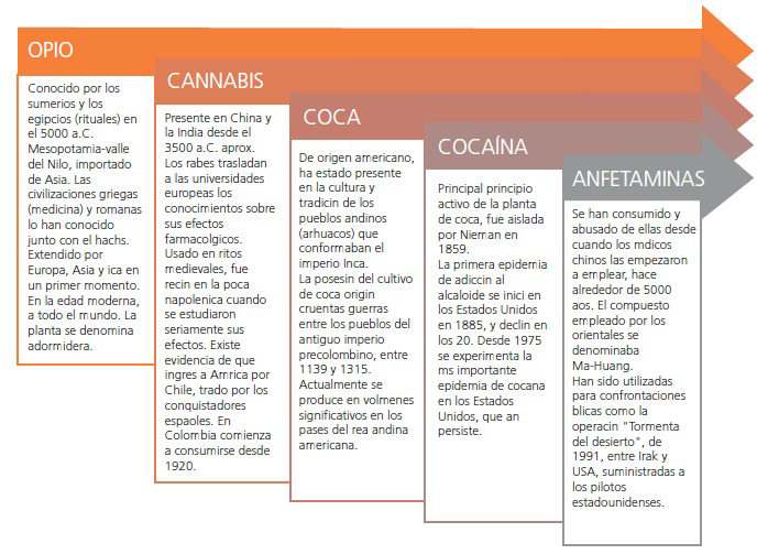 Existen períodos desiguales de surgimiento y consolidación de las sustancias psicoactivas, procesos exitosos en todos los casos, pues mantienen vigorosa vigencia hasta la actualidad. En la figura 1 se incluye una breve referencia histórica acerca de cinco de las SPI (materias primas y principios activos) más consumidas según el Informe Mundial de Drogas 2018, elaborado por la Oficina de Naciones Unidas contra la Droga y el Delito (UNODC): opio, cannabis, coca, cocaína y anfetaminas.