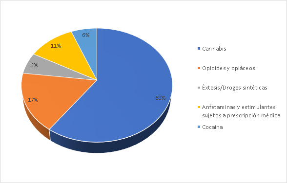 El informe mundial de la Oficina de las Naciones Unidas contra la Droga y el Delito (UNODC) de 2018 afirma que alrededor de 275 millones de personas en todo el mundo, es decir, aproximadamente el 5,6 % de la población mundial, con edades comprendidas entre los 15 y los 64 años, consumió drogas en al menos una ocasión en 2016. En 2018, la cifra superó los 300 millones de personas, el equivalente a toda la población residente en los Estados Unidos ese año. Según el informe, el consumo mundial de SPI denota una notable jerarquización, con predominio absoluto del cannabis o marihuana, con un 60 % de las preferencias mundiales. Le siguen de lejos los opioides y opiáceos, con un 17 %. Las anfetaminas, el éxtasis y la cocaína continúan en las preferencias, pero en menor proporción (gráfico 1).