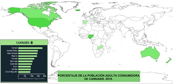 Según el mapa 1, Islandia, Estados Unidos y Nueva Zelanda poseen los porcentajes de población adulta consumidora de cannabis más elevados del mundo. A diferencia de la coca y la amapola, el cannabis se puede producir en cualquier lugar del mundo mediante la generación artificial de las condiciones climáticas. América anglosajona, Europa y Oceanía, que coinciden con el mundo desarrollado, son los principales mercados consumidores. En África destaca Nigeria, en un sorprendente cuarto lugar, seguida por Zambia.