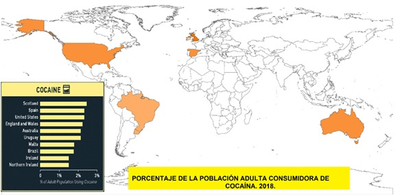 El mapa 2 evidencia una notable concentración del consumo de cocaína en el Reino Unido (principalmente Escocia), Estados Unidos y España. Se advierte también la inclusión de otros países como Brasil y Uruguay en América Latina y la presencia de Australia en el quinto lugar de porcentaje de población adulta consumidora.