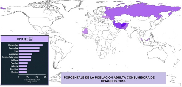 El mapa 3 muestra la distribución del consumo de opiáceos en el mundo. Existe una distribución geográfica de población consumidora coincidente con Asia central y septentrional, con un núcleo de concentración en Afganistán, país que también es el principal productor de estos psicotrópicos. En el caso de los opiáceos, también sobresalen Malasia, en el sudeste asiático, y Mauritania, en África. Sin duda, la historia milenaria del opio en Asia continúa siendo refrendada por la presencia de las principales áreas de consumo en este continente en la actualidad. Cabe destacar la presencia de la Federación de Rusia como mercado consumidor de este estupefaciente.