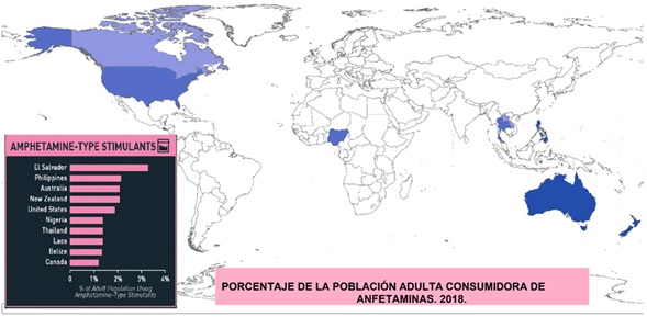 En relación con el consumo de las anfetaminas reflejado en el mapa 4, un país centroamericano (El Salvador) se ubica en el primer lugar de porcentaje de población adulta consumidora, seguido de Filipinas y Australia. Resulta notable la distribución espacial de anfetaminas en el mundo, incluso más que las otras SPI analizadas, probablemente vinculada al acceso a los precursores químicos para sintetizar estos estupefacientes. Una vez más se observa a Estados Unidos, Nigeria, Canadá y Nueva Zelanda como principales países consumidores de este estupefaciente.