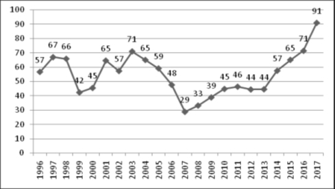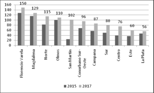 En más de una ocasión, los alfabetizadores de la UP47 expresaron en conversaciones cotidianas que el Penal estaba “estallado”, refiriéndose a que había un alto porcentaje de sobrepoblación, que producía niveles de conflictividad elevados. Durante el 2017, la sobrepoblación afectó a la totalidad de los establecimientos penales del Conurbano Bonaerense. Su tasa alcanzó un récord histórico del 91 % (gráfico 1). Eso significó que casi la mitad de los detenidos no contó con un espacio para dormir.