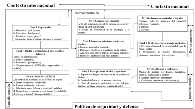 Teniendo en cuenta estas definiciones amplias, sumadas a los “elementos típicos” que deben tener las políticas de seguridad, según la DCAF, se propuso un modelo para su diseño y análisis. Este consta de un esquema poligonal distribuido alrededor de nueve niveles, basados en una concepción amplia de las políticas de seguridad y defensa, que reconocen no solo las condiciones, la voluntad y la capacidad internas, sino los distintos factores, amenazas y riesgos provenientes del exterior, tanto en su manifestación regional como hemisférica.