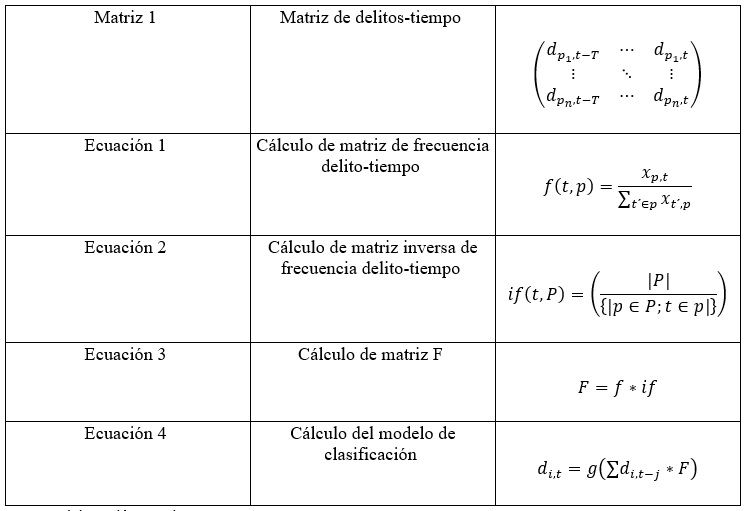 Con base en la matriz 1 de la tabla 1, se realiza la transformación de datos a partir de la ecuación 1, que es la proporción de la categoría delito en un periodo de tiempo específico relativo a todos los polígonos. Así mismo, la ecuación 2 de la tabla 1 muestra la matriz inversa que representa la proporción de la categoría delito en cada polígono relativo a todos los periodos de tiempo. De tal modo, la ecuación 3 de la tabla 1 muestra la multiplicación de las matrices ya planteadas. Esto, lleva al cálculo de la matriz F (matriz TF-IDF) que tiene dimensiones PxP y representa la relación de cada polígono con respecto a los demás. Hecho el cálculo de la matriz, esta se multiplica por cada periodo de tiempo dentro de la matriz original teniendo una matriz de dimensiones PxT que servirá como insumo para el desarrollo del modelo de clasificación. La ecuación 4 de la tabla 1 muestra la operación descrita.