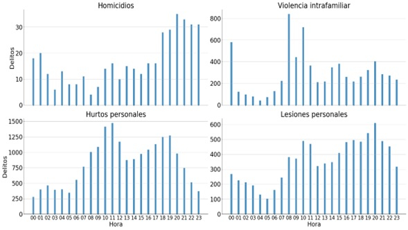 La figura 1 muestra la distribución de los cuatro delitos en Bucaramanga para cada hora del día. Los delitos ocurren con menos frecuencia entre la 1:00 a. m. y las 5:00 a. m. y suben a partir de las 6:00 a. m. El punto máximo sucede a las 10:00 a. m., con más de 2500 registrados a esa hora, dado que es el pico de hurto a personas. A partir de ahí se registra una disminución hasta menos de 1500 delitos a la 1:00 p. m., un crecimiento hasta las 7:00 p. m. y luego una gran caída hasta el final del día, al parecer por lesiones personales, homicidios y hurtos a personas.