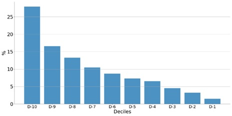 Como se presentó en la sección 3, se analizó la concentración de los delitos por secciones territoriales se agruparon las 311 secciones DANE en 10 grupos, ordenados según la cantidad de delitos perpetrados en cada grupo durante el período de 2016 a 2019. Lo anterior significa que se dividió la distribución de delitos de las secciones DANE por deciles y se calculó el porcentaje de ellos de cada decil sobre el total, como se observa en el gráfico 1. En el eje horizontal se ubican los deciles de las secciones, mientras que en el eje vertical está el porcentaje de delitos de cada decil con respecto al total.