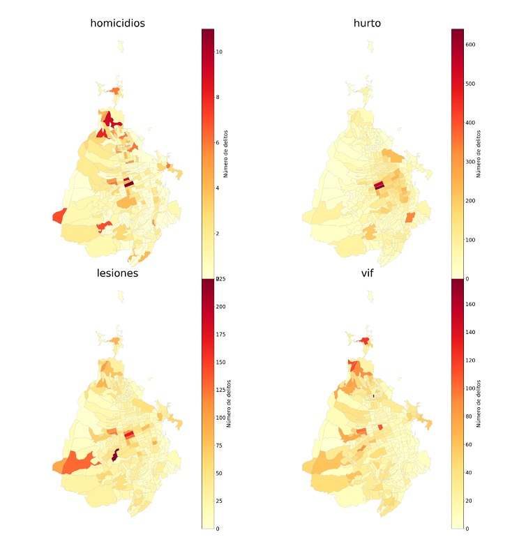 También se presenta una concentración significativa en los diferentes tipos de delitos -homicidio, violencia intrafamiliar, hurtos a personas y lesiones personales-; cerca del 30 % de cada uno de los delitos sucedieron en el 10 % de las secciones. El mapa 1 muestra la cantidad de delitos totales cometidos en Bucaramanga, tanto por sección geográfica DANE, como por tipo de delito. La ciudad de Bucaramanga cuenta con datos georreferenciados de delitos en un nivel de desagregación máximo de manzana, sin embargo, esta información no cubre la totalidad de territorio urbano de Bucaramanga. Por lo tanto, el nivel de desagregación geográfico que se utilizó para realizar los análisis geoespaciales y el modelo de predicción del delito fueron los polígonos por sección DANE. De acuerdo con lo anterior, el sector donde se concentra la mayor cantidad de hechos se encuentra en el centro de la ciudad. De igual manera, hay ciertos sectores en las periferias que presentan altos niveles de delitos en el periodo total de estudio.
