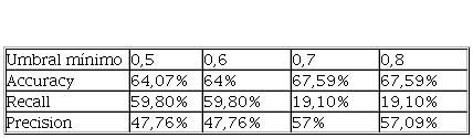 Por otro lado, la tabla 3 muestra los pronósticos del mejor modelo (KNN con frecuencia semanal) con diferentes umbrales para considerar el pronóstico de la clase delito. Al igual que en la sección anterior, al aumentar el umbral, se busca aumentar la precisión. Para validar los resultados de la predicción se utilizaron dos métricas Precision y Recall. La métrica de Precision mide el porcentaje de delitos predichos que verdaderamente fueron delitos, mientras que la métrica de Recall calcula el porcentaje de delitos que se lograron predecir de manera correcta entre el total de los delitos. De tal modo, para llegar a un pronóstico, depende del error que se esté dispuesto a tolerar entre Precision y Recall.