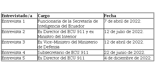 Esta conclusión se obtuvo, por un lado, a partir de la recolección y el análisis de documentos oficiales del gobierno de Ecuador, de noticias en medios de comunicación y de la aún incipiente literatura académica sobre tecnologías de vigilancia de China, y sobre el ECU 911. Por el otro lado, se obtuvieron datos primarios mediante entrevistas presenciales en Quito y de forma virtual con tomadores de decisión ecuatorianos que estuvieron en funciones durante el diseño y la implementación del ECU 911 en el período de análisis (2013-2022). En este artículo, se utilizaron fragmentos de cinco entrevistas listadas a continuación, indicando el cargo de cada uno, la fecha de la entrevista y el código correspondiente (tabla 1).