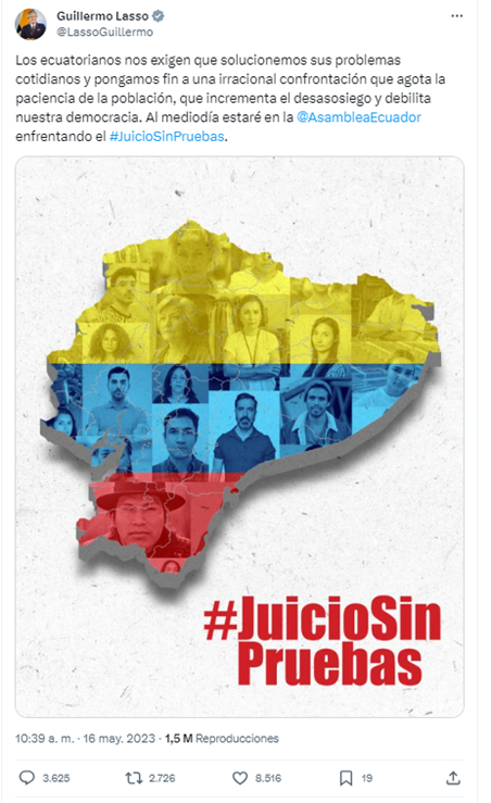 Durante la intervención de Lasso por el juicio político, identificamos una estrategia de ataque a la oposición. El expresidente se refiere a una “acusación absurda de un grupo opositor que no entiende de verdades, de justicia ni de democracia” (Lasso 2023a), incluso desconociendo que se trata de autoridades electas (asambleístas) y que el juicio político es una medida constitucional de fiscalización (figura 1).