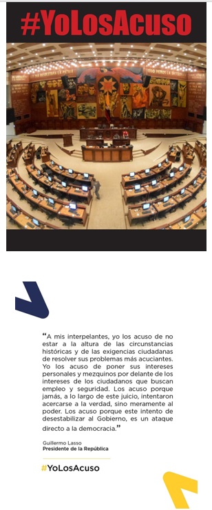 De esta manera, va cambiando el encuadre del “juicio sin pruebas” al “yo los acuso”: “A mis interpelantes, yo los acuso de no estar a la altura de las circunstancias históricas y de las exigencias ciudadanas […] Yo los acuso de poner sus intereses personales y mezquinos por delante de los intereses de los ciudadanos” (Lasso 2023a). La inclusión de imágenes con estas y otras declaraciones, acompañadas del hashtag #YoLosAcuso, intenta reforzar la responsabilidad de los asambleístas (figura 2).