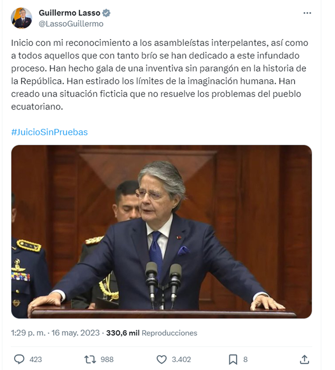 Queridos ecuatorianos, hago pública la carta que remití a la@CorteConstEcu con mi posición de defensa firme de las atribuciones que me corresponden como Presidente. Respetamos las competencias de control de constitucionalidad de la Corte. Sin embargo, insisto que la definición de la urgencia y las necesidades de la economía ecuatoriana son competencias exclusivas del Presidente de la República (Lasso 2023n).