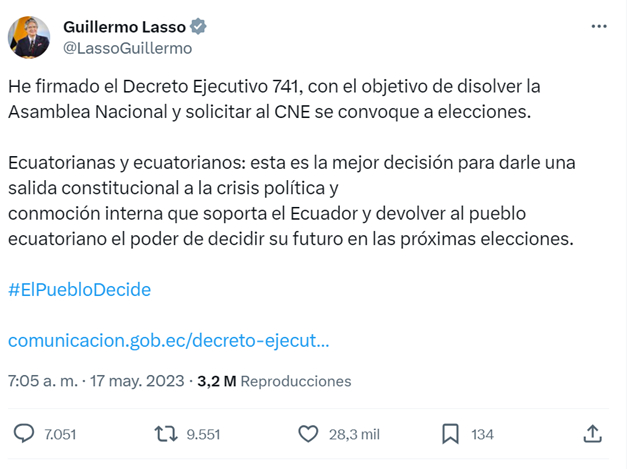 Hace ocho días, utilizando un mecanismo democrático reconocido en la Constitución de la República, puse fin a una confrontación política que tenía inmerso al país en una crisis que se agudizaba con el tiempo. Disolver la Asamblea Nacional, sobre la base del artículo 148 de nuestra Constitución, cerró un largo capítulo de desinstitucionalización y abuso de poder, liderado por sectores políticos que se habían trazado como meta la cooptación de todo el Estado. Después de esta decisión histórica, por la profundidad de su significado, nunca más un presidente de la República quedará a merced de una Asamblea que dedique su tiempo a conspirar e impedir que un Gobierno avance en la agenda para el desarrollo del país.#InformeALaNación#24DeMayo (Lasso 2023g).