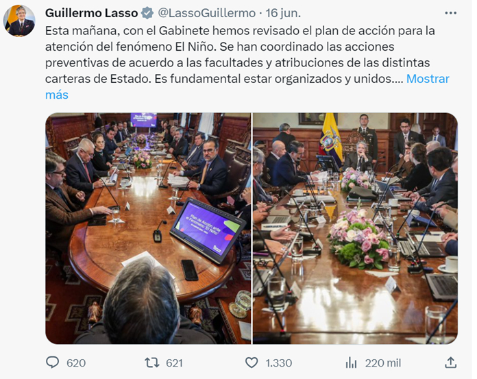 Durante todo el período, las publicaciones en Twitter van acompañadas del hashtag #NuestroTrabajoContinúa, en un intento por representar una actividad política intensa (Lasso 2023j). No en vano, este hashtag es una de las diez palabras más repetidas (16) en el corpus. Las imágenes de las publicaciones mantienen la doble característica antes mencionada, la de presentarse como un actor amable, pero firme y con liderazgo.