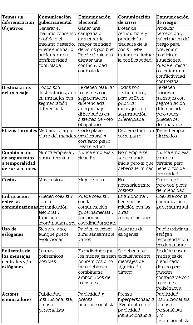 Tal y como podemos observar en la tabla 1, que ayuda a diferenciar los tipos de estrategias comunicacionales en función de la situación, la comunicación de crisis debe ofrecer certidumbre y hacerlo en un corto plazo. Además, no utiliza eslóganes y precisa mensajes claros y directos, sin valerse de los sentidos polisémicos. Uno de los riesgos en los momentos de crisis es que la comunicación para salir de ellos se confunda con aquella de naturaleza electoral (Riorda 2011b).
