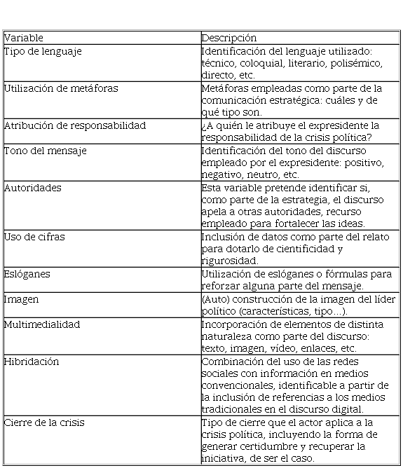 Elaboramos una matriz que recoge las principales variables para identificar la estrategia comunicacional en momentos de crisis; además, incorporamos algunas variables específicas del análisis de la comunicación digital. Las variables generadas permiten identificar las principales características de la comunicación estratégica de Lasso en redes sociales durante la última crisis política de su gobierno. Provienen del cuerpo teórico de la comunicación estratégica, la comunicación en crisis y el uso de las redes sociales por parte de los actores políticos (tabla 2).