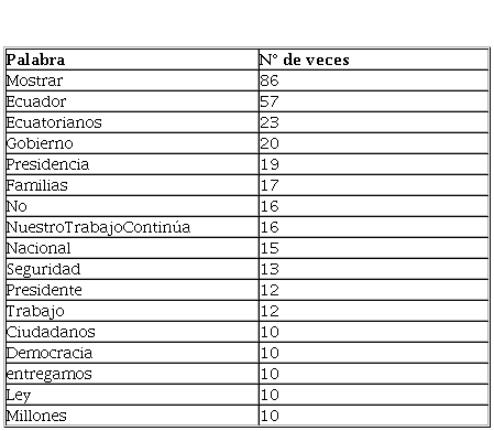 En la tabla podemos observar que las palabras más utilizadas dan cuenta de una estrategia comunicacional durante la crisis con dos dimensiones principales: el enaltecimiento del trabajo propio (“gobierno”, “presidencia”, “nuestro trabajo continúa”, “presidente”, “trabajo”, “entregamos”) y el sentido patriótico (“Ecuador”, “ecuatorianos”, “familias”, “nacional”, “democracia”), en un intento de lograr un cierre de filas de la ciudadanía durante la crisis. La incorporación de imágenes de la bandera de Ecuador y de emoticonos con la bandera como parte del texto refuerza la intencionalidad patriótica de su discurso.