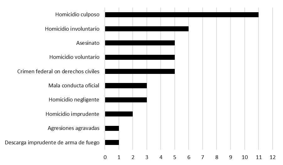 La tabla 1 muestra el número de muertes en la última década por disparos del policía, categorizadas por niveles de amenaza y el estado de las armas. En este caso el volumen de casos asociados con ‘presuntamente armado’ y nivel de amenaza ‘ataque’ son elevados. Ello ha puesto a 184 policías bajo investigación penal, según Mapping Police Violence (2023) y Gun Violence Archive (2023). El gráfico 2 muestra que más de 50 oficiales de policía han sido condenados por delitos penales relacionados con el disparo de sus armas de fuegos. Asimismo, en el gráfico sobresale el número de policías condenados por homicidios culposos, homicidios involuntarios y asesinatos. Por último, cabe destacar que las fuentes revisadas no muestran, de manera explícita, información de los costos asociados por el uso de las armas de fuego, sin embargo, el número de muertes es considerable (FBI 2021; Mapping Police Violence 2023; Gun Violence Archive 2023).