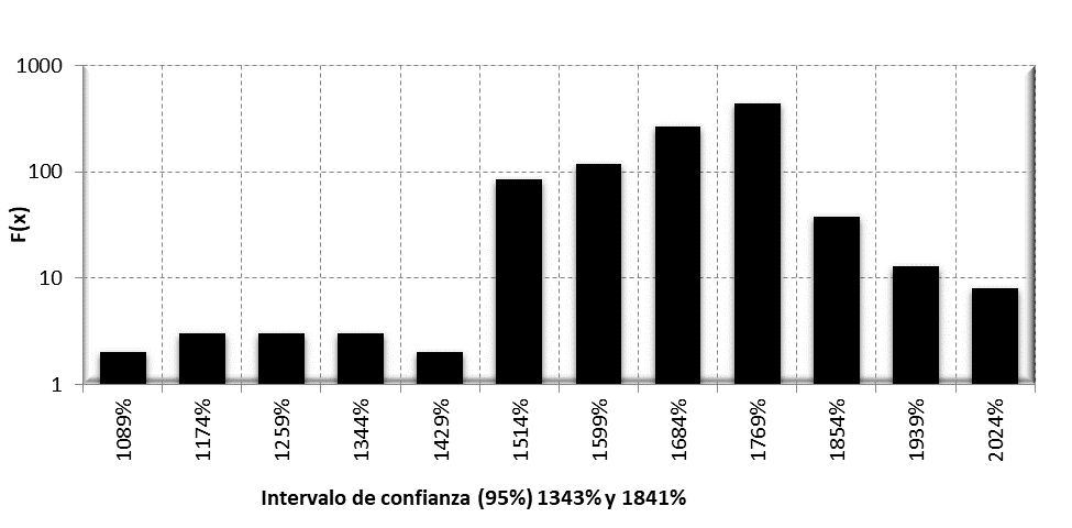 Ahora se ejecuta una simulación estocástica de Monte Carlo con 10 000 pruebas, mediante una distribución de Poisson para la frecuencia y un log-normal , así como distribuciones triangulares para medir la severidad de un resultado. De esta manera, los resultados del análisis estocástico muestran que el ROI está entre 1343% y 1841% con una confianza estadística del 95% (gráfico 3). En otras palabras, por cada un dólar invertido en adquirir, equipar y capacitar a un oficial para usar The Alternative, el retorno está entre 14 y 19 dólares.