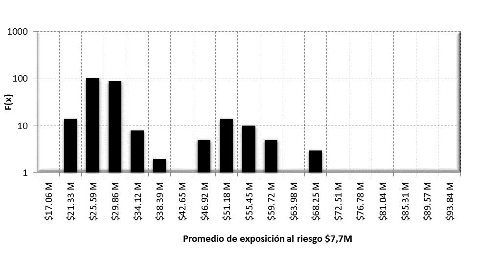 Luego, se requiere ejecutar analíticas avanzadas de simulación estocástica (Mun 2010), por ejemplo, simulaciones de Monte Carlo con un número de pruebas que oscilen de 10 000 a 1 000 000. Se utiliza una distribución de Poisson para la frecuencia y un log-normal , así como distribuciones triangulares para medir la severidad de un resultado, si así ocurre. Es decir, se tiene: