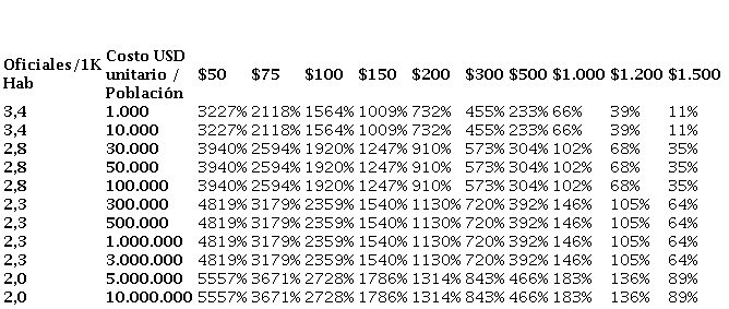 Cuanto más grande sea la ciudad, menor es el número promedio de oficiales por cada 1000 habitantes, porque el número total de oficiales aumentaría de manera sustancial y habría una disminución en la proporción marginal, lo que significa que el ROI aumentaría (es decir, de 1564% en una ciudad de 10 000 sube a 2728% a una gran metrópolis de 10 000 000). Además, cuanto más caro sea el equipo menos letal, menor será el ROI. Por ejemplo, un arma de descarga de alta energía que cuesta 1500 dólares por oficial, solo puede producir un ROI del 11% en una ciudad de 10 000 personas.
