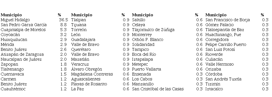 A escala municipal el 36% la red de finanzas offshore de México corre a cargo de la alcaldía Miguel Hidalgo, ubicada en la Ciudad de México; con el 8,8%, le sigue el municipio de San Pedro Garza García, ubicado en el estado de Nuevo León; posteriormente está la alcaldía Cuajimalpa de Morelos de Ciudad de México con una participación porcentual del 5,3%; la alcaldía Coyoacán participa con el 3,2%. Sin embargo, a escala estatal, dicha estructura territorial de finanzas offshore se reconfigura en orden de prelación de la manera siguiente: Ciudad de México participa con poco más del 50%; el estado de México aglutina el 10,4%, Nuevo León el 5,0%, Jalisco el 4,6%, Yucatán el 4,5% y Quintana Roo el 3,7%.