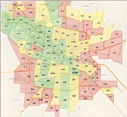 La modalidad de policiamiento por proximidad se materializó a través de una división geográfico territorial de la ciudad. Córdoba fue dividida en su totalidad a partir de la delimitación de unidades geográficas diferenciadas según grados de vulnerabilidad social: rojas (alta vulnerabilidad), amarillas (vulnerabilidad media) y verdes (baja vulnerabilidad) (mapa 1).