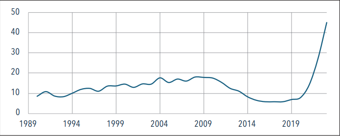 El gráfico 1, basado en información del Ministerio del Interior y del Banco Mundial, muestra la evolución de la tasa de homicidios en el país desde 1990 hasta los tres primeros trimestres del 2023. Ecuador cerró el 2023 con una tasa de 46 homicidios por cada 100 000 habitantes, convirtiendo a zonas del país, como Esmeraldas y Durán, en algunas de las más violentas del mundo, y al país con la tasa más alta de homicidios en América Latina.
