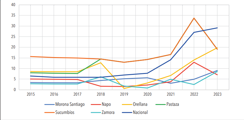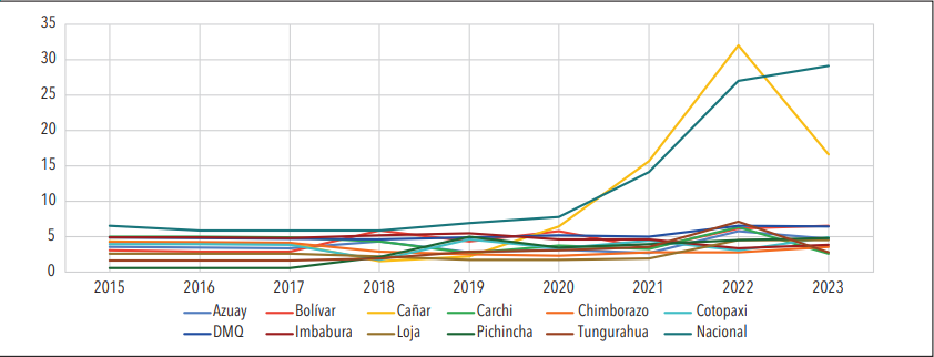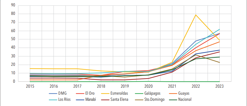 En el 2022, la tasa de homicidios nacional fue de 27 asesinatos por cada 100 000 habitantes, con una desviación estándar muy alta, 19,69, debido a la concentración en las provincias de la Costa. Guayaquil presentó una tasa de 48 homicidios en 2022, mientras Esmeraldas se ubicó en 81. Las provincias de la Costa tienen tasas de casi una desviación estándar por encima de la tasa nacional. La única provincia de la Sierra por encima de la tasa nacional es Cañar, que además presenta índices muy altos de violencia estructural intrafamiliar y contra la mujer, con una alta cantidad de femicidios.